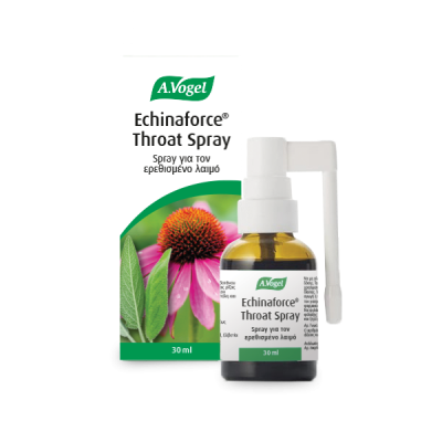 Το Echinaforce® Throat Spray περιέχει βάμμα 2 φρέσκων 100% βιολογικής καλλιέργειας βοτάνων, Echinacea purpurea και φασκόμηλο. Έχει αποδειχτεί από πολλές κλινικές μελέτες ότι η Echinacea purpurea και το φασκόμηλο έχουν ισχυρή δράση στην ενίσχυση του ανοσοποιητικού συστήματος και βοηθούν τον οργανισμό να αντιμετωπίσει αποτελεσματικά παθογόνους μικροοργανισμούς. Το spray επιτρέπει την απ’ ευθείας εφαρμογή του βάμματος των φρέσκων βοτάνων στον βλεννογόνο του φάρυγγα, βελτιστοποιώντας με αυτόν τον τρόπο τα ευεργετικά του αποτελέσματα.