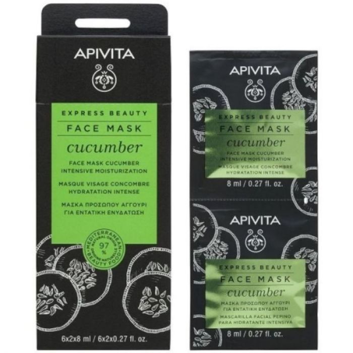 Η μάσκα προσώπου EXPRESS BEAUTY με αγγούρι, το πιο δροσερό λαχανικό της Μεσογειακής διατροφής με 95% περιεκτικότητα σε νερό, προσφέρει άμεση δροσιά και ενυδάτωση.
