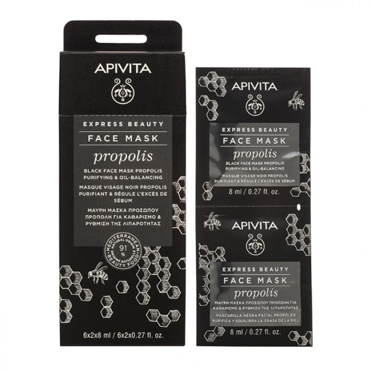 Η μαύρη μάσκα προσώπου EXPRESS BEAUTY με πρόπολη, ένα παραδοσιακό γιατρικό της Μεσογείου με αντιμικροβιακή δράση, καθαρίζει σε βάθος και εξισορροπεί τις λιπαρές επιδερμίδες, ακόμα κι αυτές με τάση για ακμή.