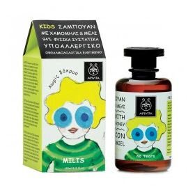 Σαμπουάν με ήπιους καθαριστικούς παράγοντες, χαμομήλι & μέλι, νερό καλέντουλας, αιθέριο έλαιο Χαμομήλι κατάλληλο για παιδιά και βιολογικά και φυτικά συστατικά που καθαρίζει απαλά τα μαλλιά ενώ τα ενυδατώνει και τα απαλύνει.