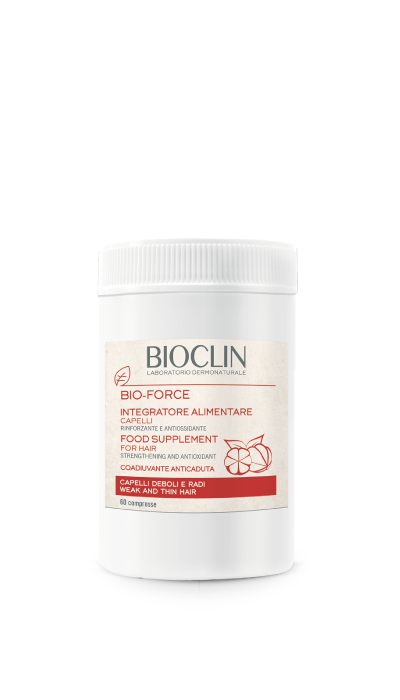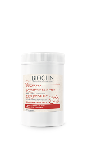 Το Bioclin Bio-Force Συμπλήρωμα Διατροφής διαθέτει εξειδικευμένη σύνθεση για την υποστήριξη της υγείας των μαλλιών. Περιέχει L-κυστεΐνη, L-μεθειονίνη, βιταμίνες Β5-Β6-Β7-Β9, χαλκό, ψευδάργυρο, DHA (από έλαιο άλγης) και εκχυλίσματα από guarana & σπόρους σταφυλιού.
