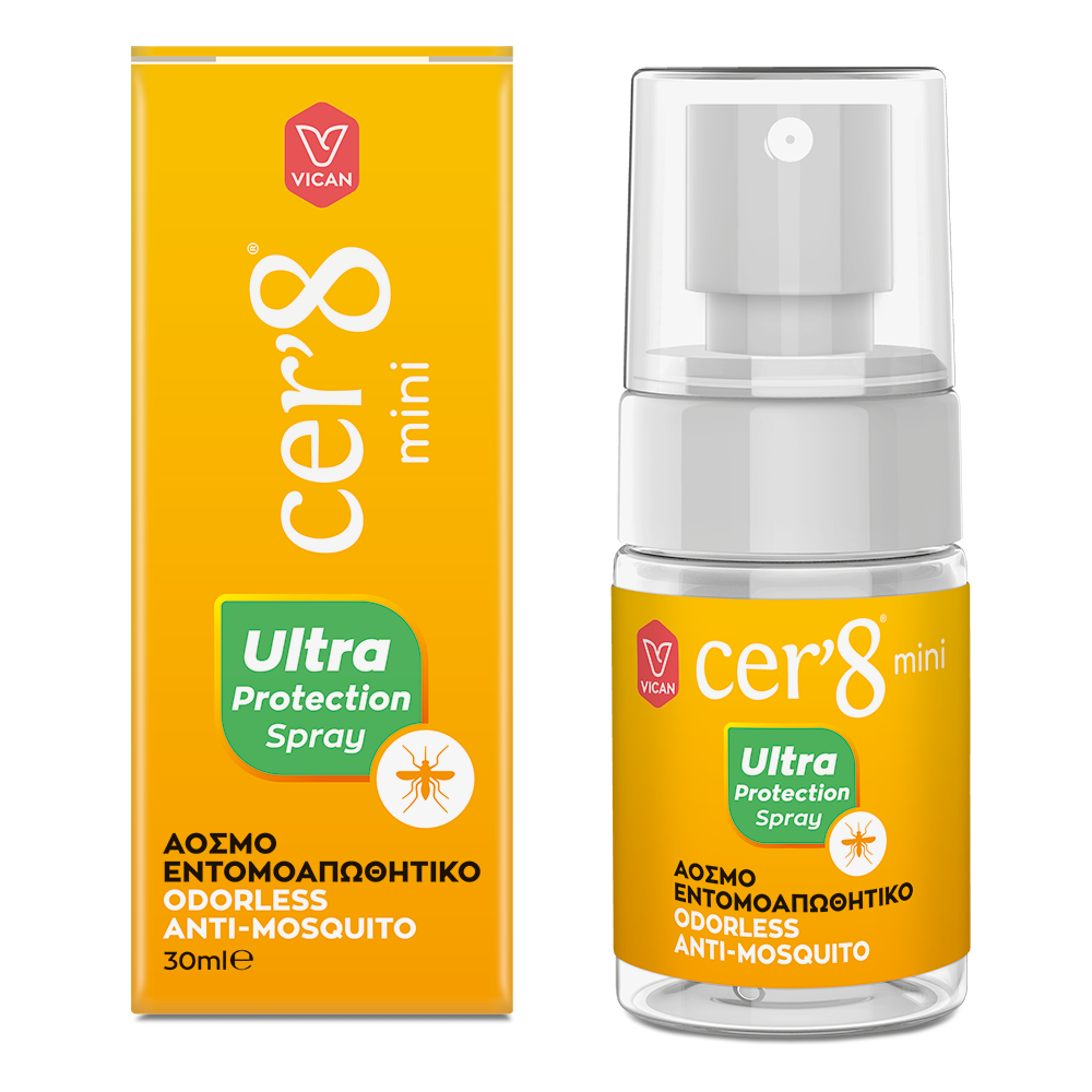 Το άοσμο εντομοαπωθητικό Cer’8 UltraProtectionSpray προστατεύει αποτελεσματικά από κουνούπια, συμπεριλαμβανομένου του "Ασιατικού κουνουπιού τίγρης", σκνίπες και άλλα έντομα.