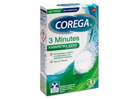 Οι τεχνητές οδοντοστοιχίες είναι περίπου 10 φορές πιο μαλακές από τα φυσικά σας δόντια και ο καθαρισμός τους με μια συνηθισμένη οδοντόκρεμα μπορεί να χαράξει την επιφάνειά τους δημιουργώντας σημεία στα οποία μπορούν να αναπτύσσονται βακτήρια. Τα καθαριστικά δισκία Corega 3 Minutes σας βοηθούν να καθαρίζετε την οδοντοστοιχία σας με καλύτερο τρόπο από ότι η οδοντόκρεμα*, καθώς δεν περιέχουν λειαντικές ουσίες, με αποτέλεσμα να καθαρίζουν χωρίς να χαράσσουν. Σε μόλις 3 λεπτά, καταπολεμούν το 99,9% των βακτηρίων που προκαλούν κακοσμία* και βοηθούν στην απομάκρυνση της πλάκας και των λεκέδων, όταν χρησιμοποιούνται σύμφωνα με τις οδηγίες χρήσης. Έτσι μπορείτε να διατηρήσετε την οδοντοστοιχία σας πιο καθαρή, πιο φρέσκια και πιο λαμπερή.