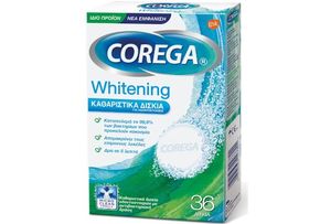 Οι τεχνητές οδοντοστοιχίες είναι περίπου 10 φορές πιο μαλακές από τα φυσικά σας δόντια και ο καθαρισμός τους με μια συνηθισμένη οδοντόκρεμα μπορεί να χαράξει την επιφάνειά τους δημιουργώντας σημεία στα οποία μπορούν να αναπτύσσονται βακτήρια. Τα καθαριστικά δισκία Corega Whitening σας βοηθούν να καθαρίζετε την οδοντοστοιχία σας με καλύτερο τρόπο από ότι η οδοντόκρεμα*, καθώς δεν περιέχουν λειαντικές ουσίες, με αποτέλεσμα να καθαρίζουν χωρίς να χαράσσουν. Σε μόλις 5 λεπτά, καταπολεμούν το 99,9% των βακτηρίων που προκαλούν κακοσμία* και βοηθούν στην απομάκρυνση της πλάκας και των λεκέδων, όταν χρησιμοποιούνται σύμφωνα με τις οδηγίες χρήσης. Έτσι μπορείτε να διατηρήσετε την οδοντοστοιχία σας πιο καθαρή, πιο φρέσκια και πιο λαμπερή.