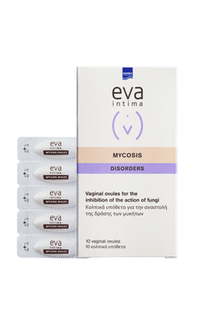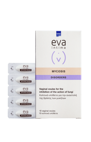Το Eva Intima Mycosis Ovules είναι ένα ιατροτεχνολογικό προϊόν ειδικά σχεδιασμένο για τον έλεγχο των μυκητιασικών λοιμώξεων οποιασδήποτε αιτιολογίας. Χάρη στον συνδυασμό του βορικού οξέος, του tea tree oil και του γαλακτικού οξέος, το Eva mycosis ovules αναστέλλει τη δράση των μυκήτων μέσα σε 48 ώρες και σε ποσοστό πάνω από 90% ενώ παράλληλα εξισορροπεί το κολπικό περιβάλλον. Η εμπλουτισμένη σύνθεσή του σε εκχύλισμα χαμομηλιού και πανθενόλη ανακουφίζει από το αίσθημα καύσου και ερεθισμού και περιποιείται τον ταλαιπωρημένο κολπικό βλεννογόνο.