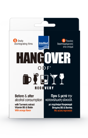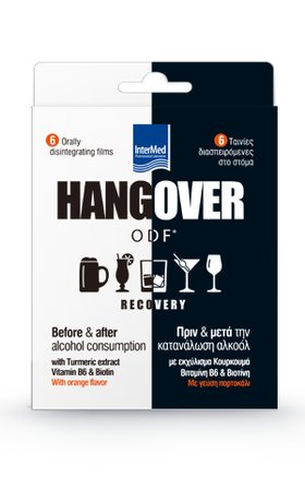 To συμπλήρωμα διατροφής Hangover ODF με εκχύλισμα κουρκουμά, βιταμίνη Β6 και βιοτίνη, είναι ιδανικό για χρήση πριν και μετά την κατανάλωση αλκοόλ για την μείωση της κόπωσης και την αναπλήρωση του οργανισμού με τις απαραίτητες βιταμίνες και τα θρεπτικά συστατικά.