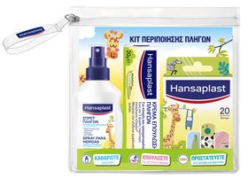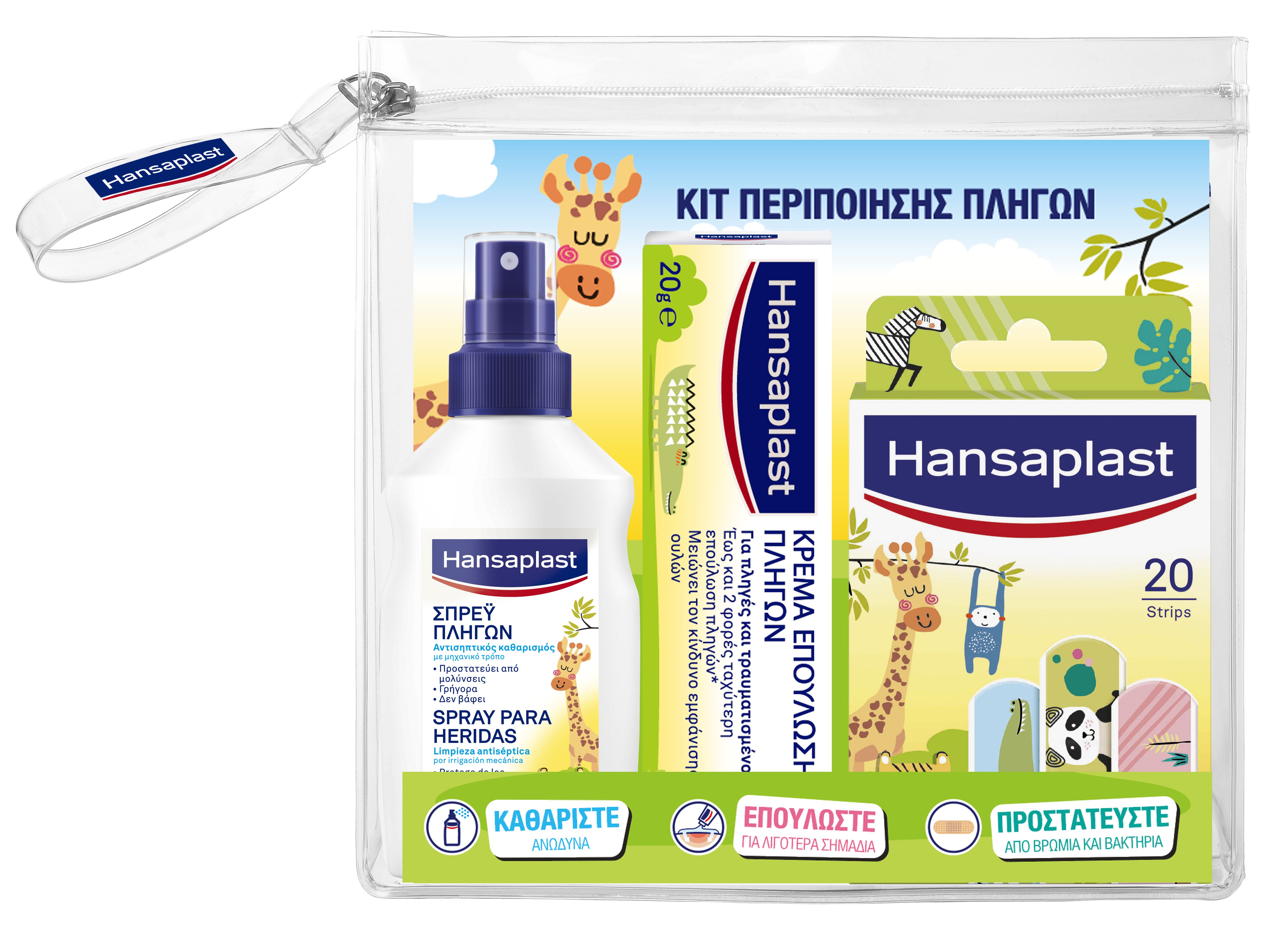 Καθαρίστε την πληγή με το Σπρέυ καθαρισμού πληγών, Επουλώστε με την κρέμα επούλωσης και Προστατεύστε την πληγή με τα επιθέματα Hansaplast!