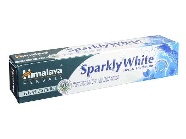 Η οδοντόκρεμα Sparkling White της Himalaya είναι μια επαναστατική βοτανική φόρμουλα βασισμένη στην τεχνολογία των φυτικών ενζύμων η οποία απομακρύνει με ήπιο τρόπο τους αντιαισθητικούς λεκέδες από την επιφάνεια των δοντιών. Περιέχει παπαϊνη και βρομελίνη, δύο ένζυμα τα οποία βρίσκονται στην Παπάγια και στον Ανανά και συμβάλλουν στην ασφαλή λεύκανση των δοντιών, καθώς και Miswak και Γαρύφαλλο τα οποία προσφέρουν 24-ωρη προστασία από τα μικρόβια.