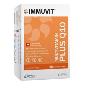 Η πολυβιταμίνη Immuvit Plus Q10 είναι ένα πλήρες, σύγχρονο και ισορροπημένο συμπλήρωμα διατροφής, το μοναδικό με δύο εκχυλίσματα Ginseng, Κorean Panax Ginseng και Siberian Ginseng. Περιέχει επιπλέον το αντιοξειδωτικό συνένζυμο Q10, βιταμίνες C, D, σύμπλεγμα βιταμινών Β, μέταλλα και ιχνοστοιχεία, σε μορφή μαλακών καψακίων. Ιδανικό για άτομα με αυξημένες διατροφικές ανάγκες, ή με αυξημένο αίσθημα ατονίας. Ενισχύει τη σωματική και πνευματική εγρήγορση.