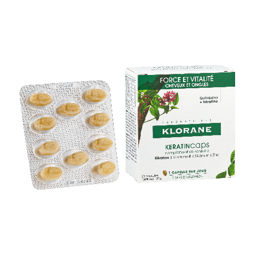 Το συμπλήρωμα διατροφής KERATINcaps της Klorane είναι πλούσιο σε απαραίτητα μικροθρεπτικά συστατικά που δρουν εκ των έσω διατηρώντας τα μαλλιά δυνατά και υγιή. Οι κάψουλες περιέχουν μια σύνθεση με βάση το εκχύλισμα κινίνης, ένα σύμπλεγμα βιταμινών Β, τον ψευδάργυρο, το σελήνιο και την κερατίνη για την αποκατάσταση της δύναμης και της ζωτικότητας των ταλαιπωρημένων μαλλιών. Η πρόσληψη ενισχυτικών μικροθρεπτικών συστατικών αναζωογονεί τα μαλλιά και ενισχύει το στέλεχος της τρίχας. Θεραπεία διάρκειας 3 μηνών, μία κάψουλα την ημέρα.