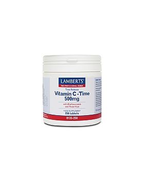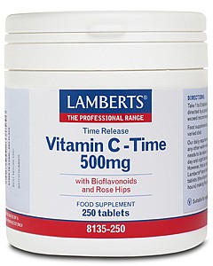 To σκεύασμα Vitamin C Time Release 500mg της Lamberts παρέχει εγγυημένα 500mg Βιταμίνης C σε δισκία ελεγχόμενης αποδέσμευσης και μία σημαντική ποσότητα βιοφλαβονοειδών (ρουτίνη, κερσετίνη, κιτρίνη και εσπεριδίνη) τα οποία συμβάλλουν στην απορρόφησή της από τον οργανισμό και σκόνη καρπών αγριοτριανταφυλλιάς (Rose Hips). Όπως όλα τα σκευάσματα της Lamberts, παρασκευάζεται εντός του Ηνωμένου Βασιλείου σύμφωνα με τα αυστηρά πρότυπα της Φαρμακευτικής GMP (Pharmaceutical GMP).