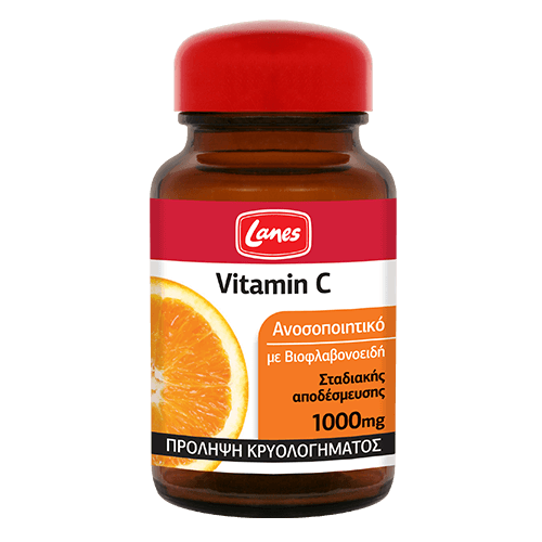 Η Lanes Βιταμίνη C 1000mg με βιοφλαβονοειδή είναι ένα συμπλήρωμα διατροφής σταδιακής αποδέσμευσης σχεδιασμένο για παρατεταμένη δράση. Η βιταμίνη C συμβάλλει στην φυσιολογική λειτουργία του ανοσοποιητικού συστήματος, ενισχύοντας την άμυνα και τη θωράκιση του οργανισμού ενάντια στο κοινό κρυολόγημα. Ο συνδυασμός της Βιταμίνης C με Βιοφλαβονοειδή συμβάλλει στην καλύτερη απορρόφηση & αποτελεσματικότητα. Η βιταμίνη C ενισχύει την άμυνα & καλή λειτουργία του οργανισμού και δίνει ζωντάνια και ενέργεια. Χάρη στην πολύτιμη ιδιότητά της για προστασία των κυττάρων από το οξειδωτικό στρες βοηθά στην αντιμετώπιση των ελευθέρων ριζών.