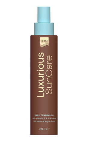 Το Luxurious Sun Care Dark Tanning Oil είναι ξηρό λάδι που χάρη στη μεταξένια σύνθεσή του ενυδατώνει την επιδερμίδα σε βάθος και χαρίζει γρήγορο, έντονο και χρυσαφένιο μαύρισμα που διαρκεί, χωρίς να αφήνει λιπαρό υπόλειμμα. Περιέχει 95,0 % συστατικά φυσικής προέλευσης: