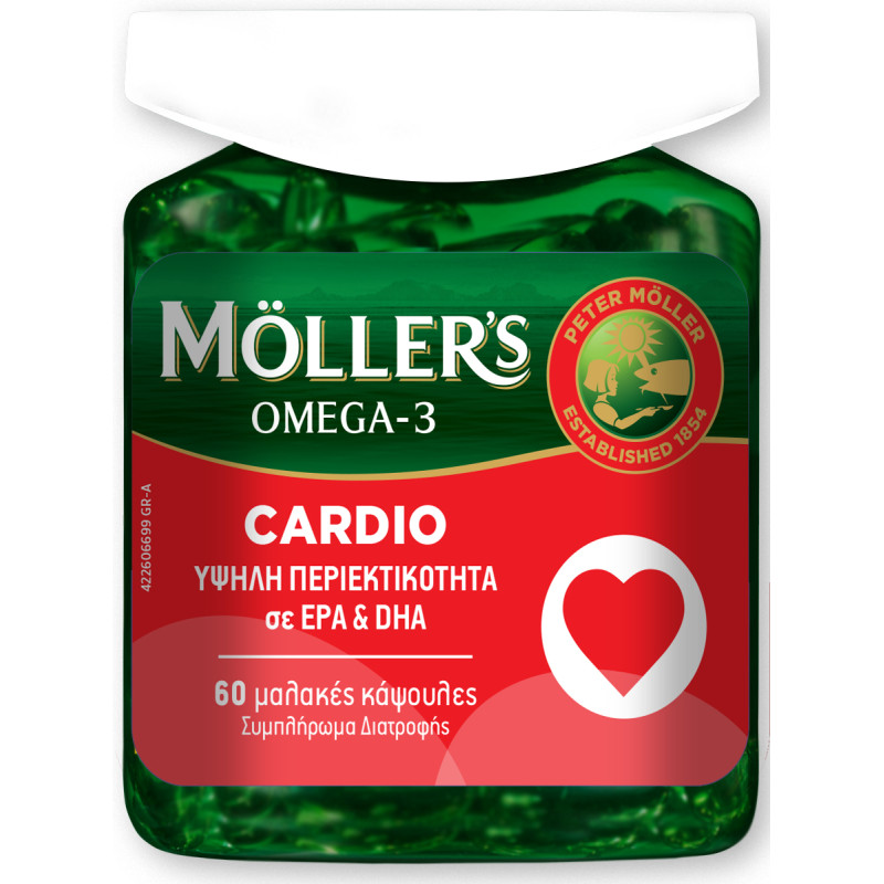 Το Möller’s Cardio σε κάψουλες είναι συμπυκνωμένο ιχθυέλαιο με υψηλή περιεκτικότητα σε EPA και DHA (240mg και 320mg αντίστοιχα). Αποτελεί πλούσια πηγή ωμέγα-3 λιπαρών οξέων. Το Möller’s Cardio είναι μια συμπυκνωμένη πηγή ωμέγα-3 λιπαρών οξέων.