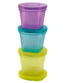 Die NUK Fresh Foods Frischebehälter sind ideal, um selbstgekochten Brei direkt nach der Zubereitung einzufüllen, im Kühlschrank zu verstauen oder sogar einzufrieren. Die Behälter sind aufeinander stapelbar und so besonders platzsparend. Die Frischebehälter haben eine runde Form und sind in den Größen 65ml, 75ml und 85ml erhältlich. Jede Packung enthält jeweils zwei Behälter jeder Größe. So haben Sie immer eine frische Mahlzeit für Ihr Kind parat!