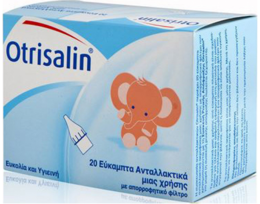 Η συσκευασία ανταλλακτικών Otrisalin περιέχει 20 εύκαμπτα ανταλλακτικά ακροφύσια μιας χρήσης με απορροφητικό φίλτρο που χρησιμοποιούνται με τη συσκευή Ρινικής Απόφραξης Otrisalin για μωρά.