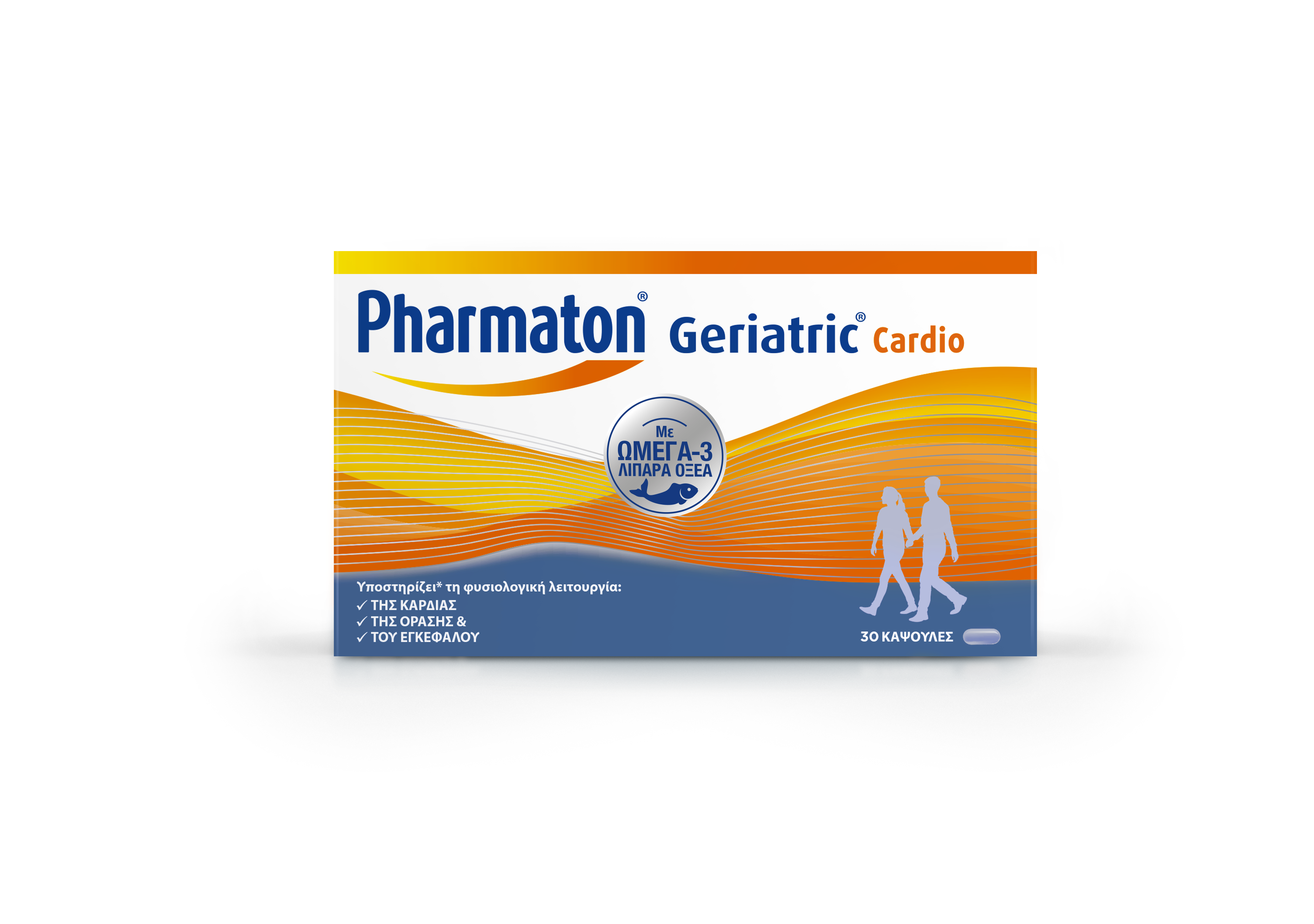 Pharmaton® Geriatric® Cardio με ΩΜΕΓΑ-3 ΛΙΠΑΡΑ ΟΞΕΑ, βιταμίνες και μέταλλα, συστατικά που συμβάλλουν στη φυσιολογική λειτουργία της καρδιάς*, του εγκεφάλου* και της όρασης*. Επιπρόσθετα, υποστηρίζουν τη φυσιολογική γνωσιακή λειτουργία (όπως μνήμη και συγκέντρωση), συμβάλλουν στη μείωση της κόπωσης & στη φυσιολογική λειτουργία του ανοσοποιητικού.