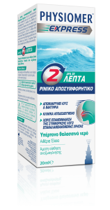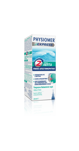 Το Physiomer Express ανακουφίζει από τη ρινική συμφόρηση σε μόλις 2 λεπτά και συμβάλλει στο να αποφευχθεί η εξάπλωση της μόλυνσης. Προσφέρει ένα ευχάριστο αίσθημα φρεσκάδας και αφήνει τη μύτη σας καθαρή και ελεύθερη.