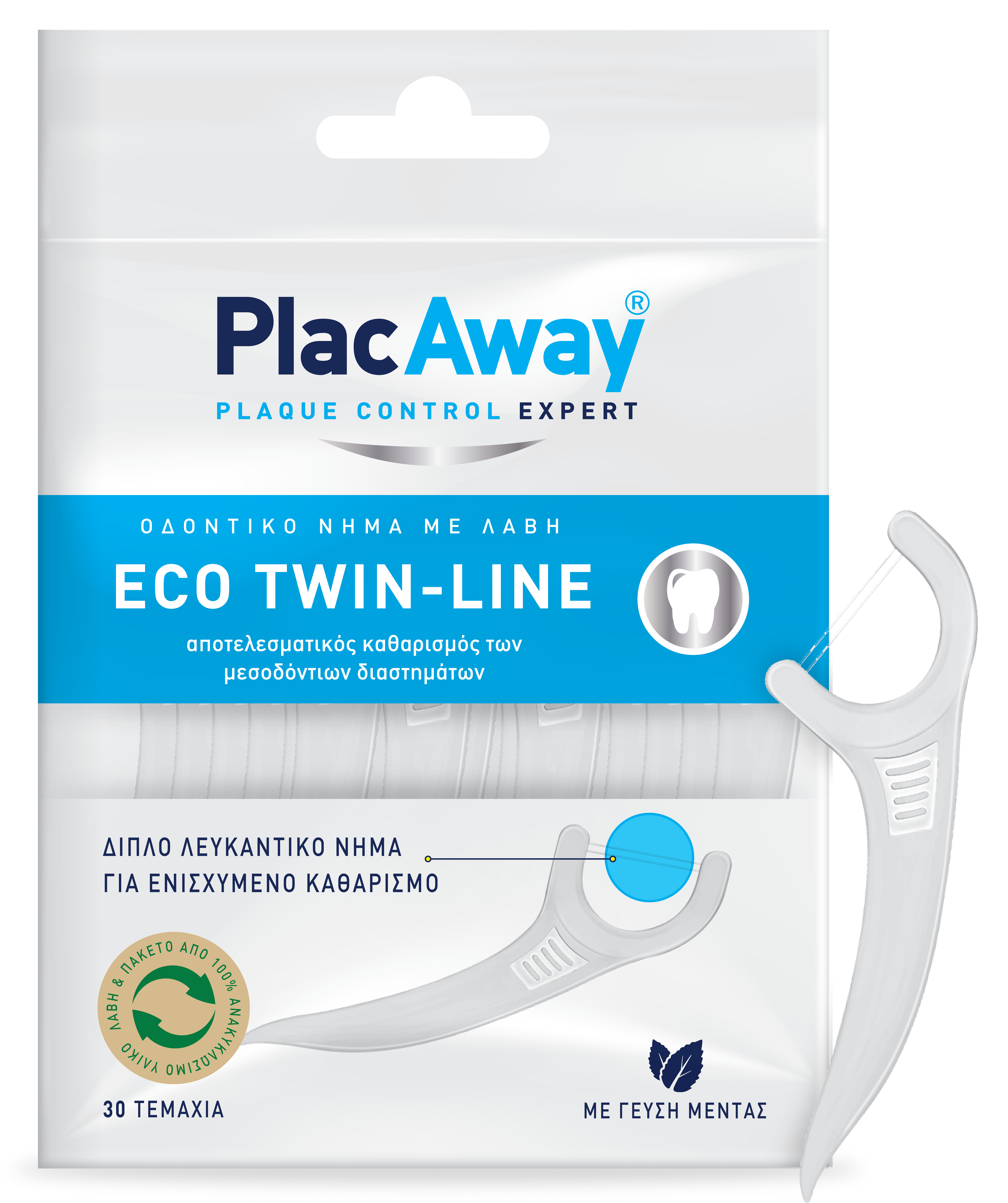 Νέο Plac Away Twin Line Διπλό οδοντικό νήμα με λαβή για αποτελεσματικό καθαρισμό των μεσοδόντιων διαστημάτων. Αφαιρεί την πλάκα, καθαρίζει αποτελεσματικά. Για καθαρά χαμόγελα εύκολα, πάντα & παντού. Βολικό για χρήση 'on the go' σε συσκευασία που ξανακλείνει.