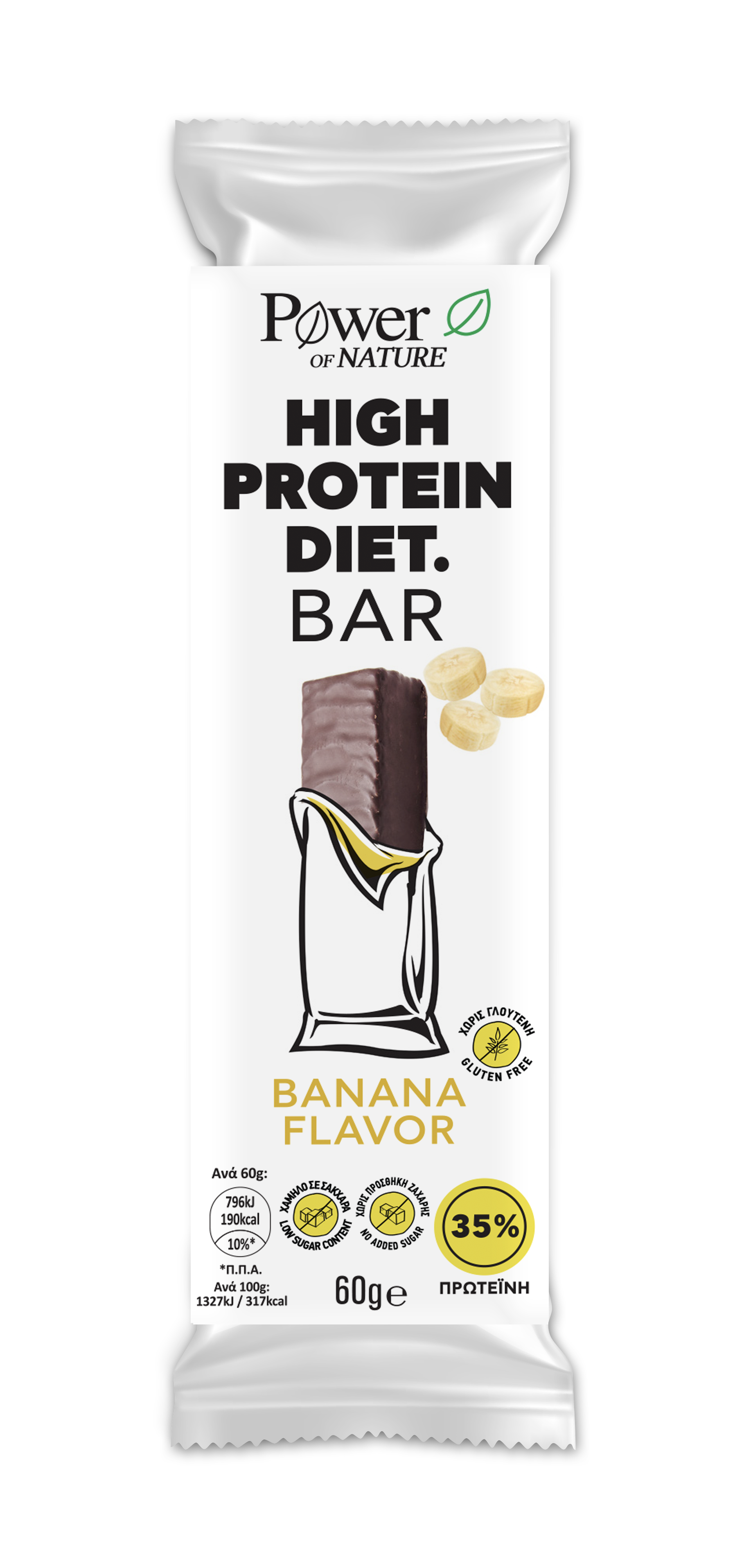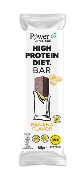 Μπάρα με υψηλή περιεκτικότητα σε πρωτεΐνες (35%) από πρωτεΐνες σόγιας και ορού γάλακτος. Με γεύση μπανάνα και επικάλυψη μαύρης σοκολάτας.
