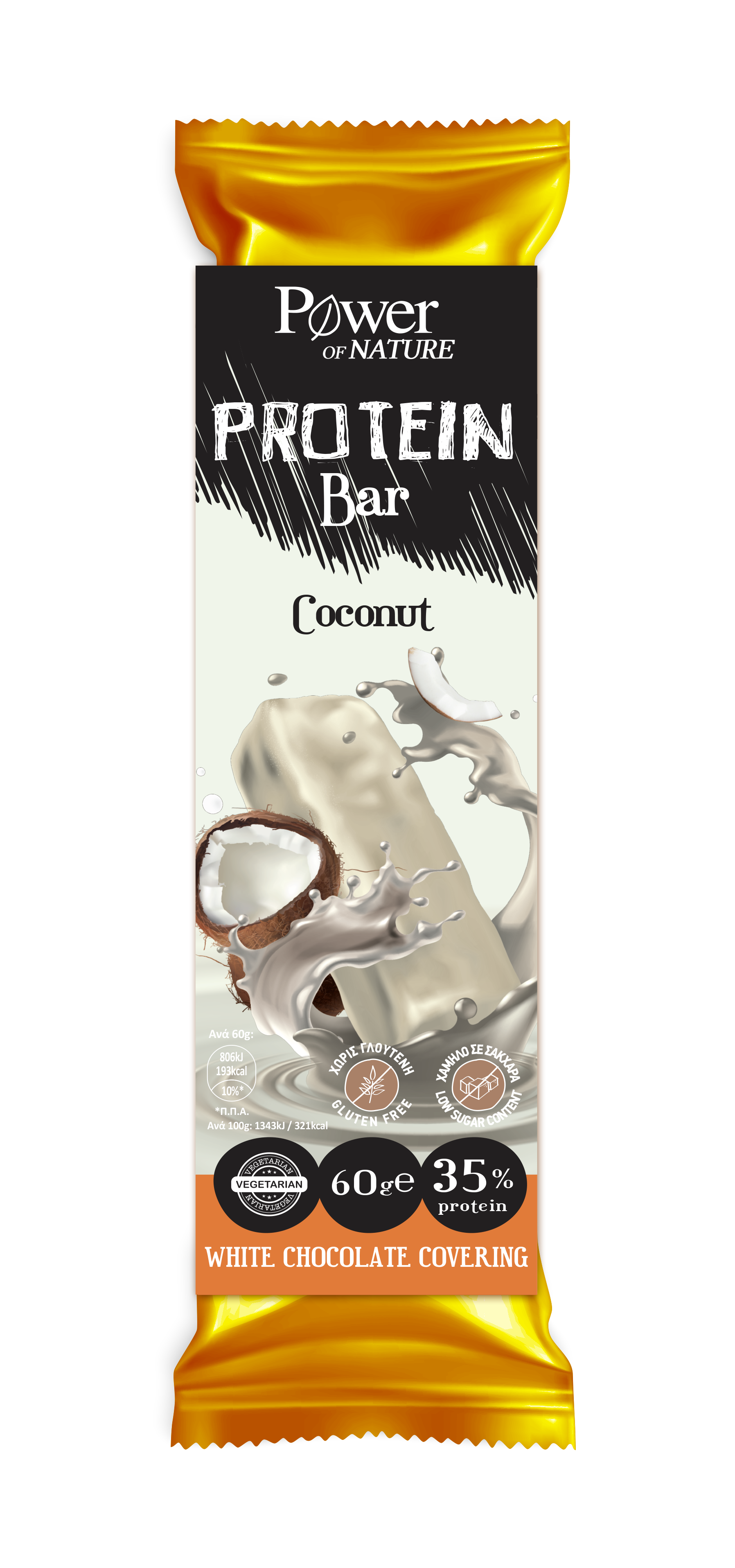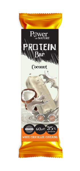 Μπάρα με υψηλή περιεκτικότητα σε πρωτεΐνες (35%) από πρωτεΐνες σόγιας και ορού γάλακτος. Με γεύση καρύδα και επικάλυψη λευκής σοκολάτας.