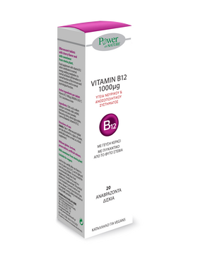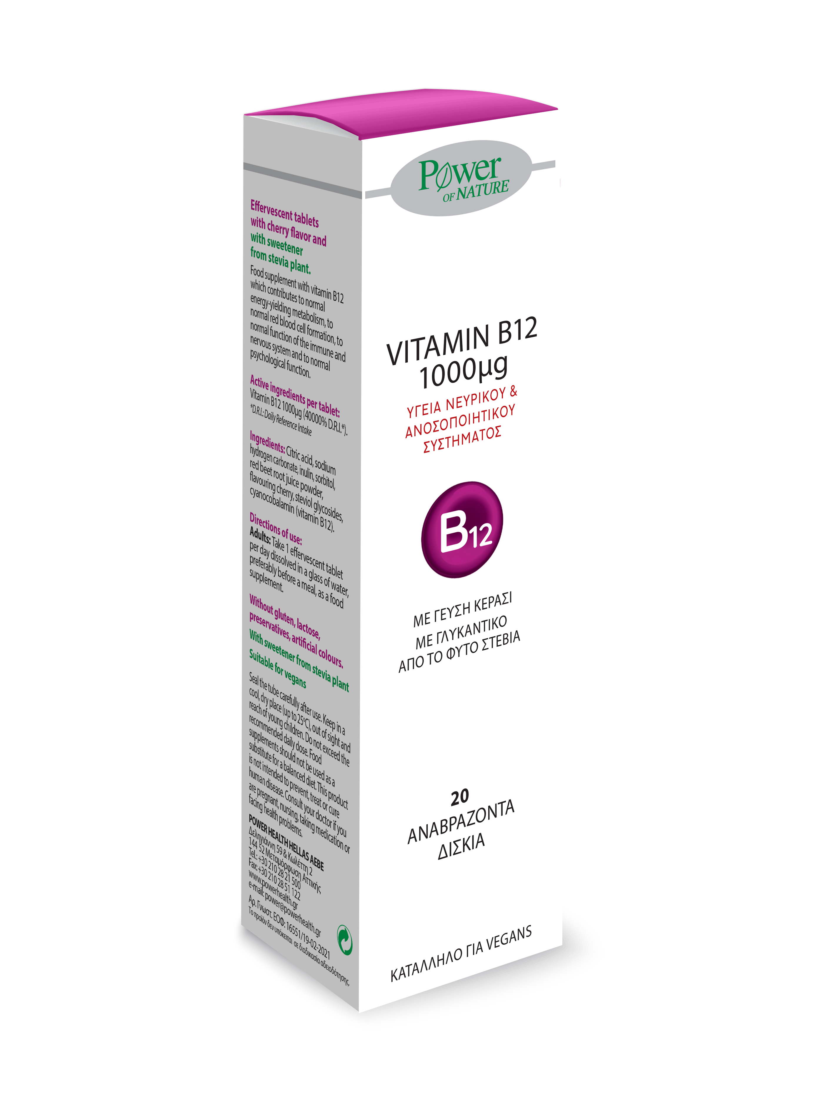 Συμπλήρωμα διατροφής σε αναβράζοντα δισκία με γεύση κεράσι και με γλυκαντικό από το φυτό στέβια. Περιέχει βιταμίνη Β12 η οποία συμβάλλει στη φυσιολογική λειτουργία των μεταβολικών διεργασιών που αποσκοπούν στην παραγωγή ενέργειας, στο φυσιολογικό σχηματισμό ερυθρών αιμοσφαιρίων, στη φυσιολογική λειτουργία του ανοσοποιητικού και του νευρικού συστήματος και στη φυσιολογική ψυχολογική λειτουργία.