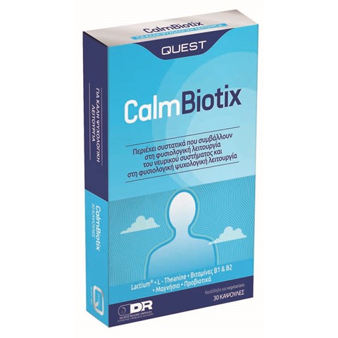Το CalmBiotix της Quest είναι ένα συμπλήρωμα διατροφής που έχει σχεδιαστεί ειδικά για όσους είναι πιεσμένοι, ανήσυχοι, νιώθουν ένταση ή ταραχή λόγω αυξημένου άγχους ή στρες και αναζητούν μια φυσική υποστήριξη για τη διαχείρισή του. Προτείνεται για κάθε στρεσογόνο κατάσταση, όπως υψηλές απαιτήσεις στην εργασία, εξετάσεις, συναισθηματική ανισορροπία, προσωπικά ή κοινωνικά προβλήματα, καθώς και όταν υπάρχει εκνευρισμός λόγω διαφόρων καταστάσεων, όπως λόγω διακοπής του καπνίσματος ή επιβολής ενός αυστηρού διαιτολογίου. Περιέχει Lactium, L-theanine, φιλικά βακτήρια, βιταμίνες Β1, Β2 και μαγνήσιο.