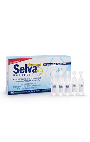 Το Selva Monodose είναι στείρο διάλυμα χλωριούχου νατρίου 0,65% σε μονοδοσιμετρικές αμπούλες μίας χρήσης για τον καθαρισμό και την αποσυμφόρηση της βρεφικής και παιδικής μύτης. Το διάλυμα του Selva είναι ισότονο με την ρινικές εκκρίσεις για την αποτελεσματική ρευστοποίηση και απομάκρυνση της συσσωρευμένης ρινικής βλέννης χωρίς να αφυδατώνει τον ρινικό βλεννογόνο ενώ με το χαμομήλι και την πανθενόλη που περιέχει, ανακουφίζει & προστατεύει από ερεθισμούς και φλεγμονές.