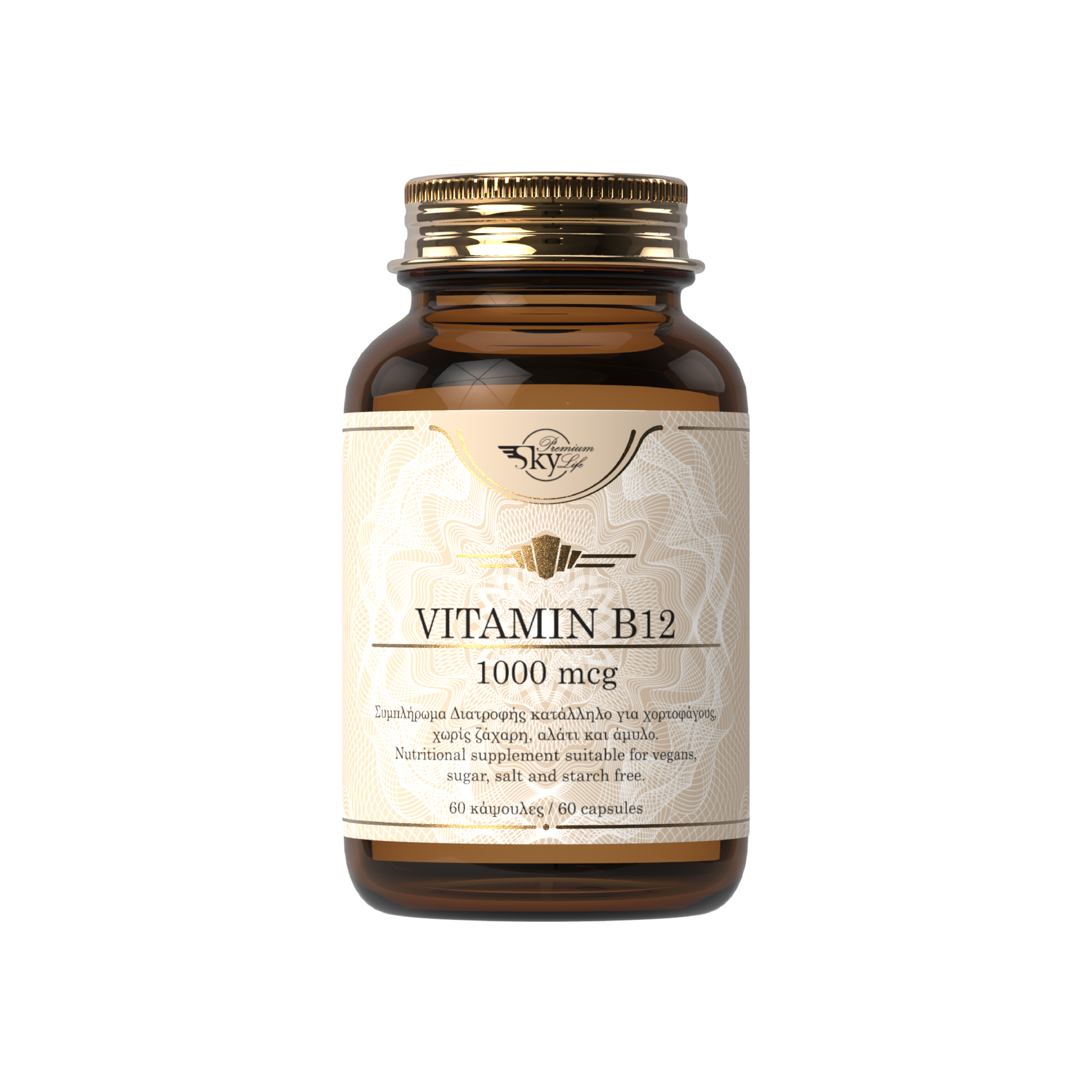 Το συμπλήρωμα διατροφής Vitamin B12 1000mcg της σειράς Sky Premium Life, εμπλουτισμένο με φολικό οξύ, αποτελεί έναν απαραίτητο σύμμαχο για όσους λαμβάνουν ελλιπείς ποσότητες βιταμίνης Β12 μέσω της διατροφής τους ή για όσους πάσχουν από έλλειψη της. Σε ορισμένες περιπτώσεις, άτομα με πεπτικές διαταραχές, ηλικιωμένοι και άτομα που ακολουθούν χορτοφαγική διατροφή ενδέχεται να εμφανίζουν έλλειψη βιταμίνης Β12, κι έτσι η πρόσληψή της μέσω ενός συμπληρώματος διατροφής μπορεί να φανεί χρήσιμη.