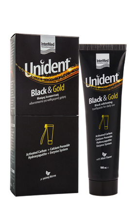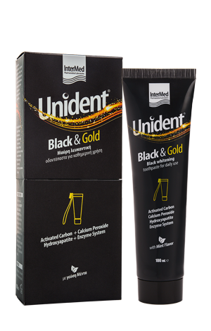 Η Unident Black & Gold Toothpaste είναι μια λευκαντική οδοντόπαστα ειδικά σχεδιασμένη για καθημερινή χρήση, καθώς περιέχει ασφαλείς λευκαντικούς παράγοντες, οι οποίοι επαναφέρουν και διατηρούν το φυσικό λευκό χρώμα των δοντιών χαρίζοντας ένα υπέροχο χαμόγελο. Αφαιρεί αποτελεσματικά και με ασφάλεια τις επιφανειακές δυσχρωμίες και ταυτόχρονα ενδυναμώνει την αδαμαντίνη καθώς της προσφέρει φθόριο και τον απαραίτητο δομικό υδροξυαπατίτη.