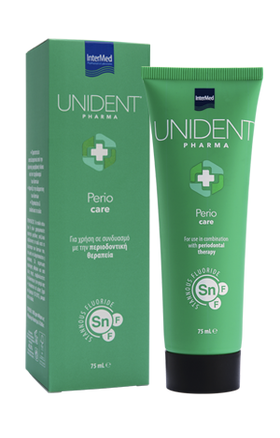 Η Unident Pharma Perio Care είναι μια Οδοντόπαστα καθημερινής χρήσης για χρήση σε συνδυασμό με τη περιοδοντική θεραπεία. Μπορεί να υποστηρίξει την πρόληψη της περιοδοντίτιδας προστατεύοντας τα δόντια και τα ούλα από τις επιθέσεις των οξέων.