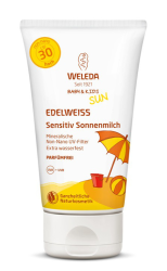 Το Weleda Sun Edelweiss Baby & Kids Sunscreen Lotion Sensitive SPF30 είναι ένα αντιηλιακό γαλάκτωμα προσώπου και σώματος υψηλής προστασίας για βρέφη και παιδιά, με φυσικά φίλτρα και βιολογικά συστατικά, κατάλληλο για ευαίσθητες επιδερμίδες.