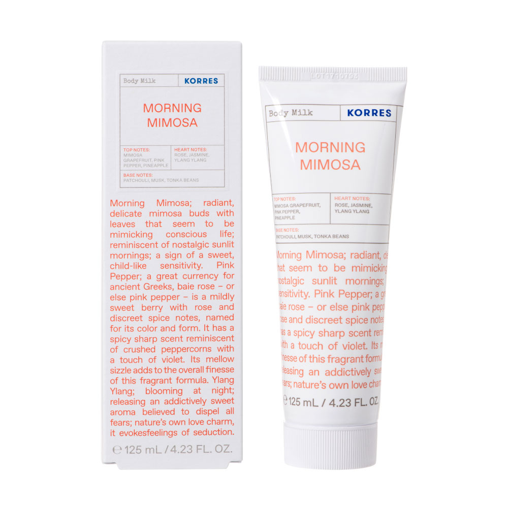 Το Korres Morning Mimosa Body Milk είναι ένα αρωματικό και ενυδατικό γαλάκτωμα σώματος, πλούσιο σε βιταμίνες, ιχνοστοιχεία και θρεπτικά έλαια, πηγή ενέργειας για την επιδερμίδα. Νότες από πατσουλί υποδέχονται μία καρδιά από τριαντάφυλλο, γιασεμί και ylang ylang. Η κορύφωση της αρωματικής συμφωνίας ανήκει στo grapefruit, το ροζ πιπέρι και τον ανανά.