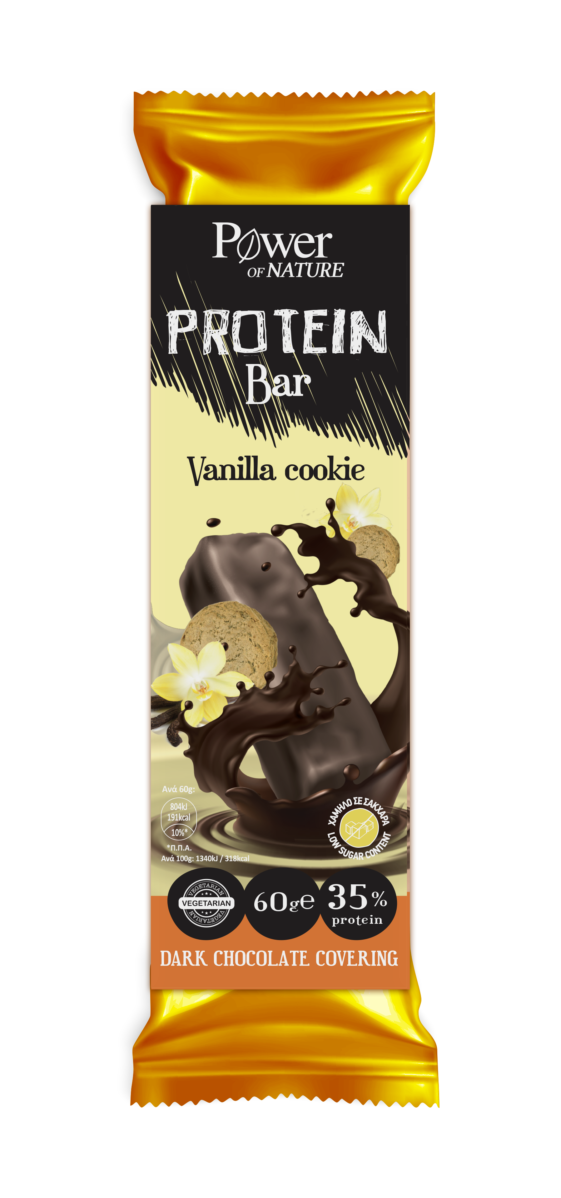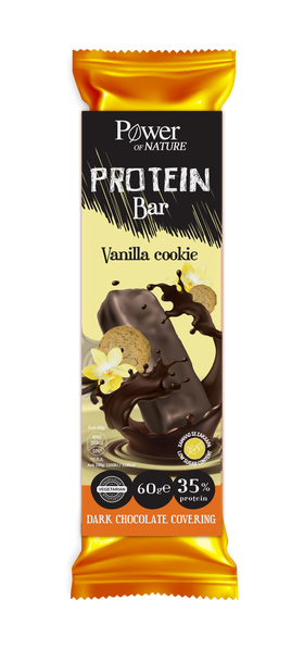 Μπάρα με υψηλή περιεκτικότητα σε πρωτεΐνες (35%) από πρωτεΐνες σόγιας και γάλακτος ορού γάλακτος. Με γεύση μπισκότο βανίλιας και επικάλυψη μαύρης σοκολάτας.
