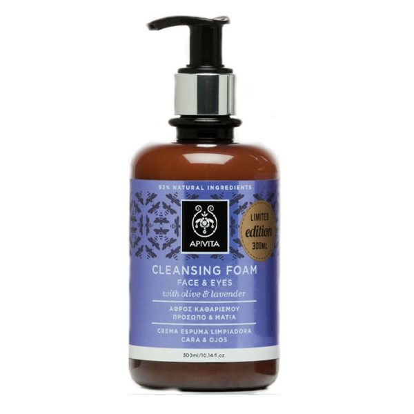 O αφρός καθαρισμού για πρόσωπο και μάτια με ελιά και λεβάντα έχει πλούσια φυσική σύνθεση και περιέχει 92% φυσικά συστατικά
