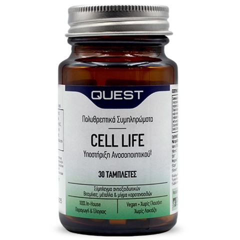 Το συμπλήρωμα διατροφής Cell Life της Quest αποτελεί έναν μοναδικό συνδυασμό των κυριότερων υδατοδιαλυτών και λιποδιαλυτών αντιοξειδωτικών συστατικών.