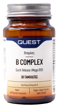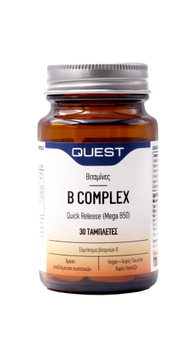 Το συμπλήρωμα διατροφής Mega B50 quick release της Quest περιέχει σύμπλεγμα βιταμινών Β, οι οποίες ενισχύουν την απελευθέρωση ενέργειας από την τροφή και μπορεί να ελαττώσουν την κόπωση και να υποστηρίξουν την αυτοσυγκέντρωση και τη μνήμη.