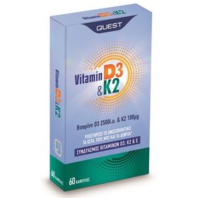 Το συμπλήρωμα διατροφής Vitamin D3 & K2 της Quest περιέχει 2500i.u. (62,5μg) βιταμίνη D στην δραστική μορφή της D3, που είναι γνωστή και ως χοληκαλσιφερόλη και 100μg βιταμίνης Κ ως μενακινόνη Κ2 στη δραστική μορφή της ΜΚ-7. Οι βιταμίνες D3 και Κ2 δρουν συνεργιστικά για τη διατήρηση της καλής κατάστασης των οστών. Επιπλέον, έχουν προστεθεί 20i.u. φυσικής βιταμίνης Ε (D-άλφα τοκοφερόλη) που λειτουργεί εξαιρετικά σε συνδυασμό με τις βιταμίνες D και Κ, αυξάνοντας την αποτελεσματικότητα του προϊόντος.