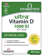 Το συμπλήρωμα διατροφής Ultra Vitamin D 1000IU της Vitabiotics παρέχει 1000 IU βιταμίνη D ανά ταμπλέτα στην ιδανική μορφή της D3, που είναι γνωστή και ως χοληκαλσιφερόλη.