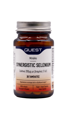 Το συμπλήρωμα διατροφής Synergistic Selenium 200μg της Quest παρέχει στον οργανισμό σελήνιο μαζί με βιταμίνες C & E που αυξάνουν τη απορρόφησή του.
