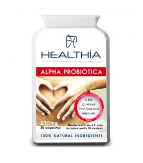Το Alpha Probiotica της Healthia είναι ένα προβιοτικό ισχυρής δράσης πολλαπλών στελεχών με 4 δισεκατομμύρια φιλικά βακτήρια ανά κάψουλα, ισοδύναμο με 8 κουπάκια γιαούρτι, χωρίς όμως τις θερμίδες, ζάχαρη, λίπος, λακτόζη ή άλλο γαλακτοκομικό στέλεχος.