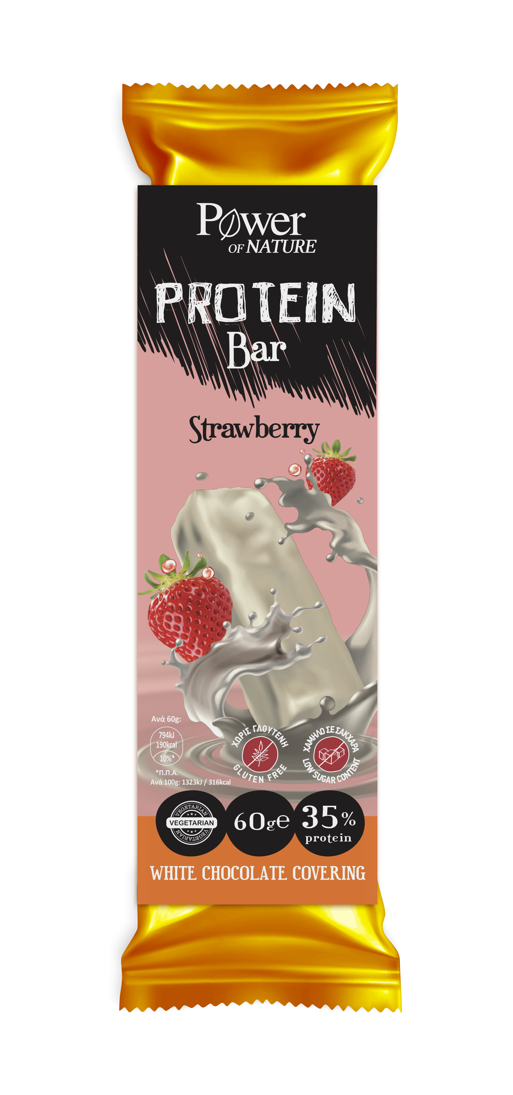 Μπάρα με υψηλή περιεκτικότητα σε πρωτεΐνες (35%) από πρωτεΐνες σόγιας και γάλακτος ορού γάλακτος. Με γεύση φράουλα και επικάλυψη λευκής σοκολάτας.