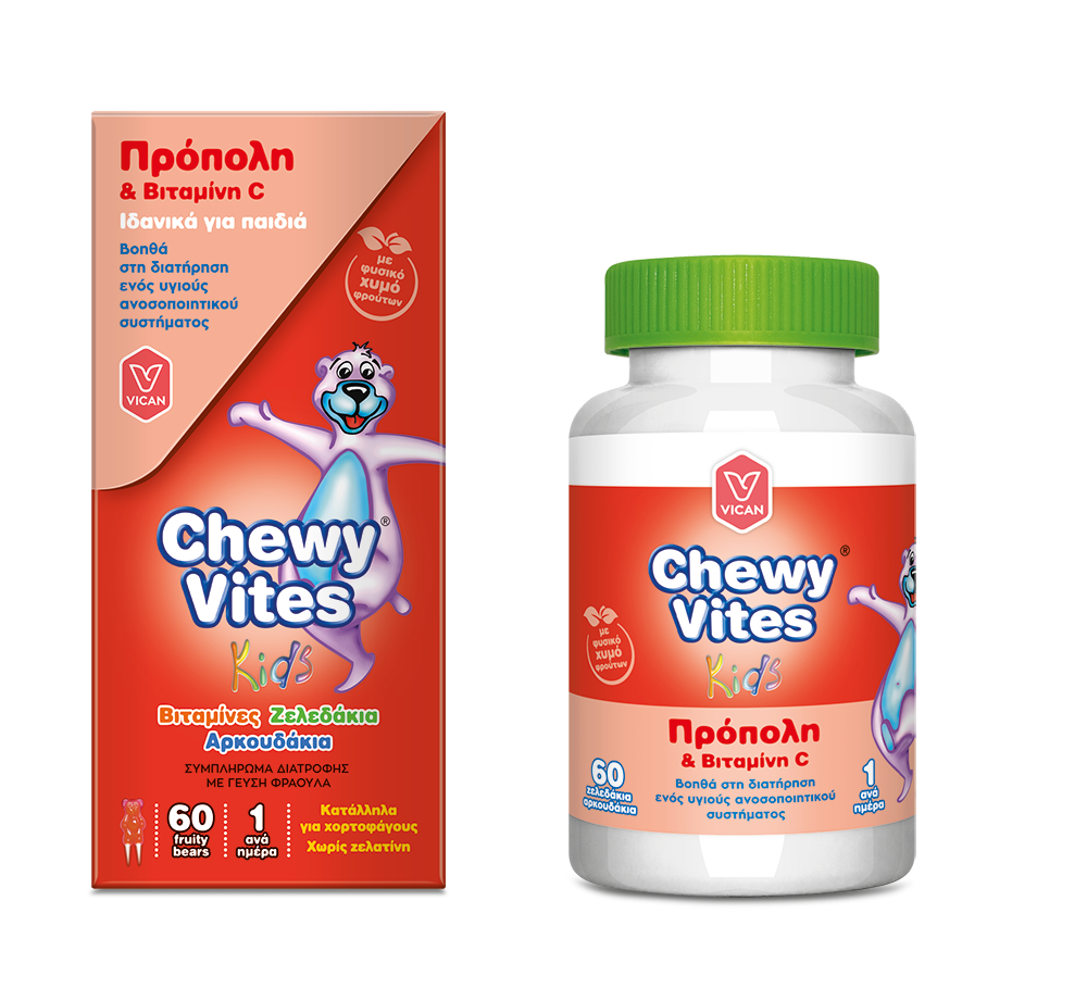 ChewyVites® Kids με Πρόπολη και Βιταμίνη C, μασώμενα φρουτώδη ζελεδάκια αρκουδάκια που συμβάλλουν στην ενίσχυση του ανοσοποιητικού συστήματος και προστατεύουν από τα κρυολογήματα, ιδιαίτερα την εποχή που τα παιδιά επιστρέφουν στο σχολείο, καθώς και κατά τη διάρκεια των χειμερινών μηνών θωρακίζοντας την άμυνά τους.