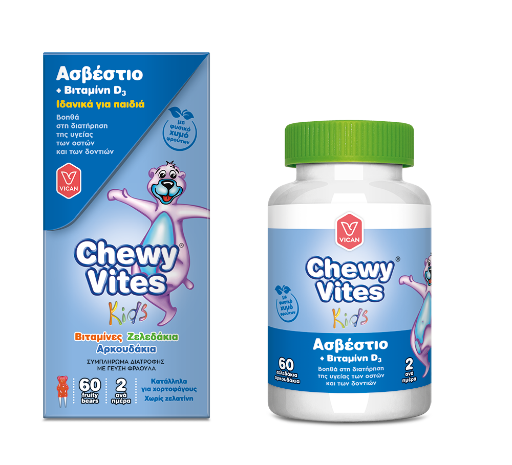 Οι ChewyVites®Kids με Ασβέστιο και Βιταμίνη D είναι μασώμενες βιταμίνες σε μορφή ζελεδάκια αρκουδάκια που συμβάλλουν στη διατήρηση των οστών και των δοντιών. Το Ασβέστιο είναι ζωτικής σημασίας για την καλή υγεία και σωστή ανάπτυξη του παιδιού. Ένα ζελεδάκι αρκουδάκι ChewyVites περιέχει 250mg Ασβεστίου και 10μg Βιταμίνης D.