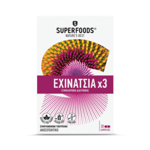 Το SUPERFOODS ΕΧΙΝΑΤΣΙΑ Χ3 περιέχει ένα συνδυασμό και από τα 3 είδη Echinacea (E. Purpurea, E. Pallida, E. Angustifolia) μαζί με Βιταμίνη C & Ψευδάργυρο Zn, που συμβάλλουν στην ενίσχυση της άμυνας του οργανισμού και στη φυσιολογική λειτουργία του ανοσοποιητικού συστήματος.