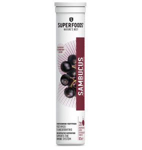 Το SUPERFOODS SAMBUCUS προέχεται από τον συμπυκνωμένο χυμό της υπερτροφής, η οποία επεξεργάζεται με πιστοποιημένη μέθοδο επεξεργασίας για τη διατήρηση όλων των θρεπτικών συστατικών της. Περιέχει επιπρόσθετα ενισχυμένη ποσότητα από Βιταμίνη C και Ψευδάργυρο – Zn, που συμβάλλουν στη φυσιολογική λειτουργία του ανοσοποιητικού συστήματος.