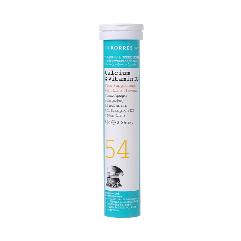 Το Korres Calcium & Vitamin D3 είναι ένα συμπλήρωμα διατροφής με ασβέστιο και βιταμίνη D3 για την υγεία των οστών σε αναβράζουσες ταμπλέτες.