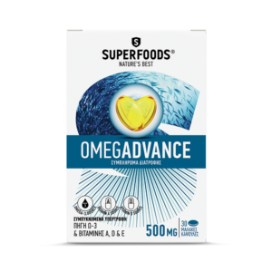 Το SUPERFOODS® OMEGADVANCE περιέχει 500 mg ιχθυέλαιο υψηλής ποιότητας και καθαρότητας. Είναι ιδιαίτερα πλούσια πηγή EPA (εικοσαπενταενοϊκό οξύ) και DHA (εικοσιδυαεξαενοϊκό οξύ), τα οποία δρουν συνεργικά και συμβάλλουν στην διατήρηση της φυσιολογικής όρασης, της φυσιολογικής λειτουργίας του εγκέφαλου και της καρδίας. Επιπλέον περιέχει βιταμίνη Α που συμβάλλει στην διατήρηση της φυσιολογική όραση, βιταμίνη E που συμβάλλει στην προστασία των κυττάρων από το οξειδωτικό στρες καθώς και βιταμίνη D που συμβάλει στην φυσιολογική κατάσταση των οστών.