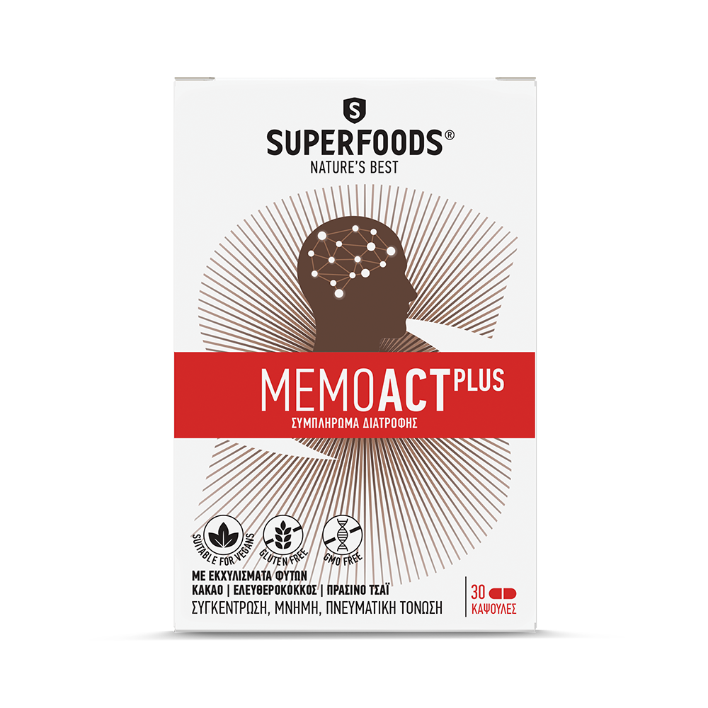 To SUPERFOODS MEMOACTPLUS είναι κατάλληλο για άνδρες και γυναίκες ώριμων ηλικιών και για άτομα με έντονες πνευματικές ανάγκες. Περιέχει ένα μοναδικό συνδυασμό από Πράσινο Τσάι, Κακάο, Ελευθερόκοκκο (Siberian Ginseng), Συνένζυμο Q10, Φυσικό Β-complex, Ψευδάργυρο που συμβάλλουν στην φυσιολογική νοητική επίδοση, στην φυσιολογική γνωσιακή λειτουργία και στην φυσιολογική λειτουργία του νευρικού συστήματος.