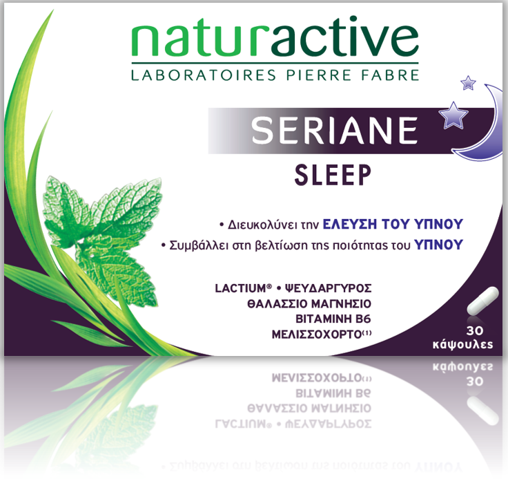 Το Seriane Sleep διευκολύνει την έλευση του ύπνου και συμβάλλει στη βελτίωση της ποιότητας του ύπνου. Πρόκειται για έναν πρωτότυπο συνδυασμό εκχυλίσματος μελισσόχορτου, θαλάσσιου μαγνησίου, βιταμίνης Β6, ψευδάργυρου και Lactium®.Το εκχύλισμα μελισσόχορτου είναι γνωστό για τις χαλαρωτικές του ιδιότητες. Διευκολύνει την έλευση του ύπνου και συμβάλλει στη βελτίωση της ποιότητας του ύπνου. Το μαγνήσιο και η βιταμίνη Β6 συμβάλλουν στη μείωση της κόπωσης και στην καλή λειτουργία του νευρικού συστήματος.